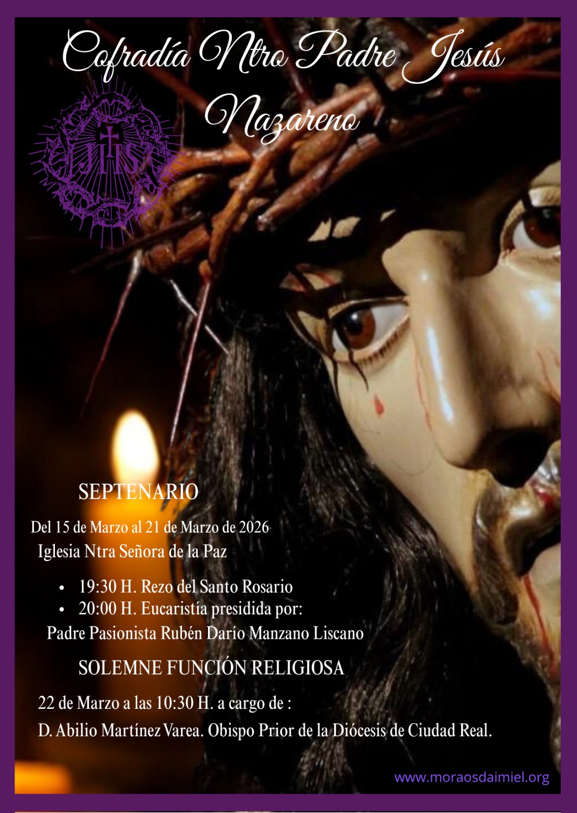 Septenario en Honor a Nuestro Padre Jesús Nazareno 05/03/2026 Se pone también en conocimiento de todos los hermanos que el Septenario en honor a Nuestro Padre Jesús Nazareno se celebrará del domingo 15 de marzo al sábado 21 de marzo, dando comienzo cada día a las 20:00 horas. VER MÁS