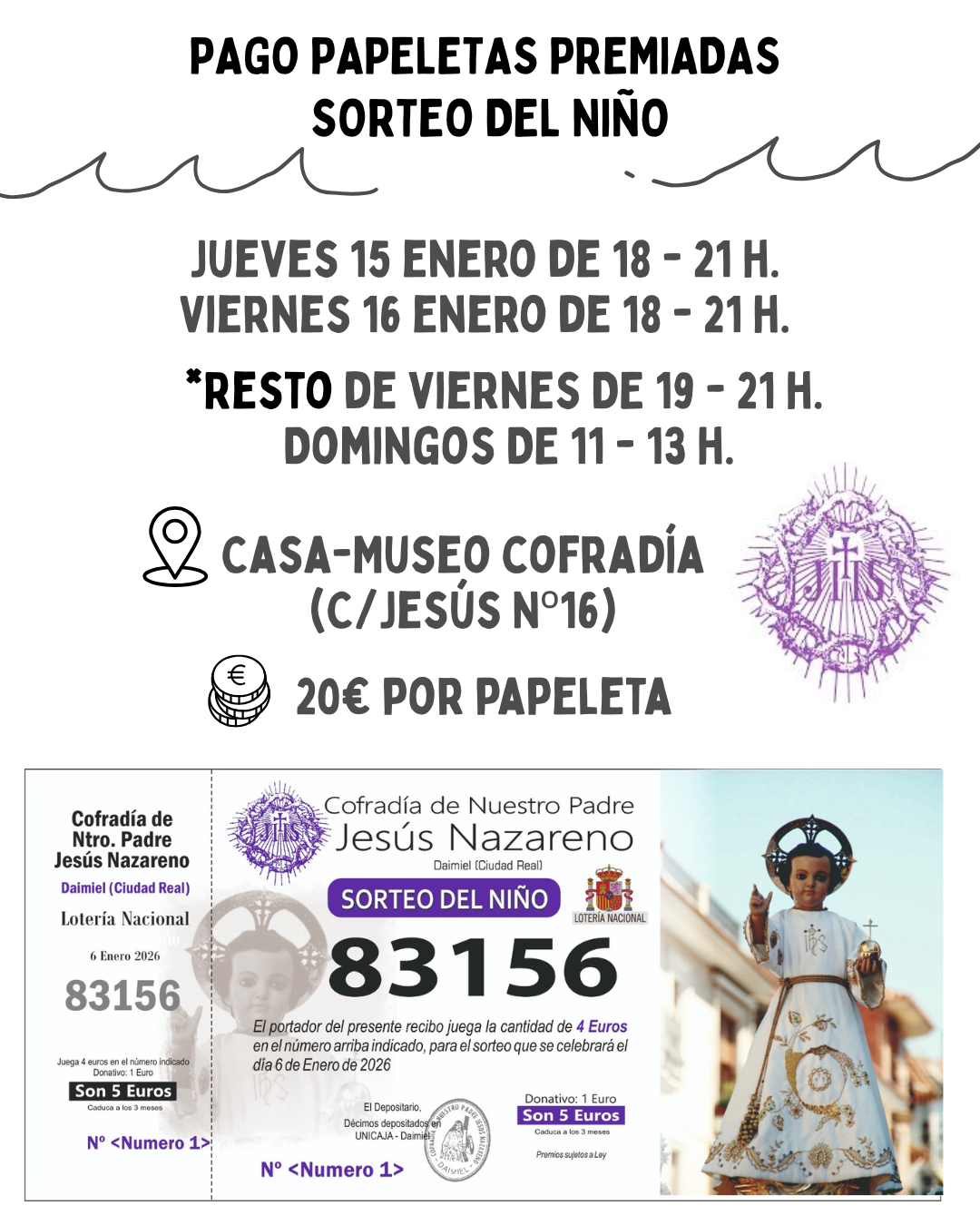 PAGO PAPELETAS PREMIADAS SORTEO DEL NIÑO 14/01/2026 Se informa a las personas agraciadas que podrán pasar a cobrar las papeletas premiadas del Sorteo del Niño en los siguientes días y horarios. VER MÁS