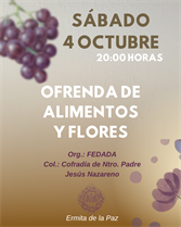 Este sábado a las 20:00 horas, como ya es tradicional, tendrá lugar la ofrenda de flores y alimentos que diversas asociaciones, colectivos y particulares ofrecen con cariño a Nuestro Padre Jesús Nazareno.