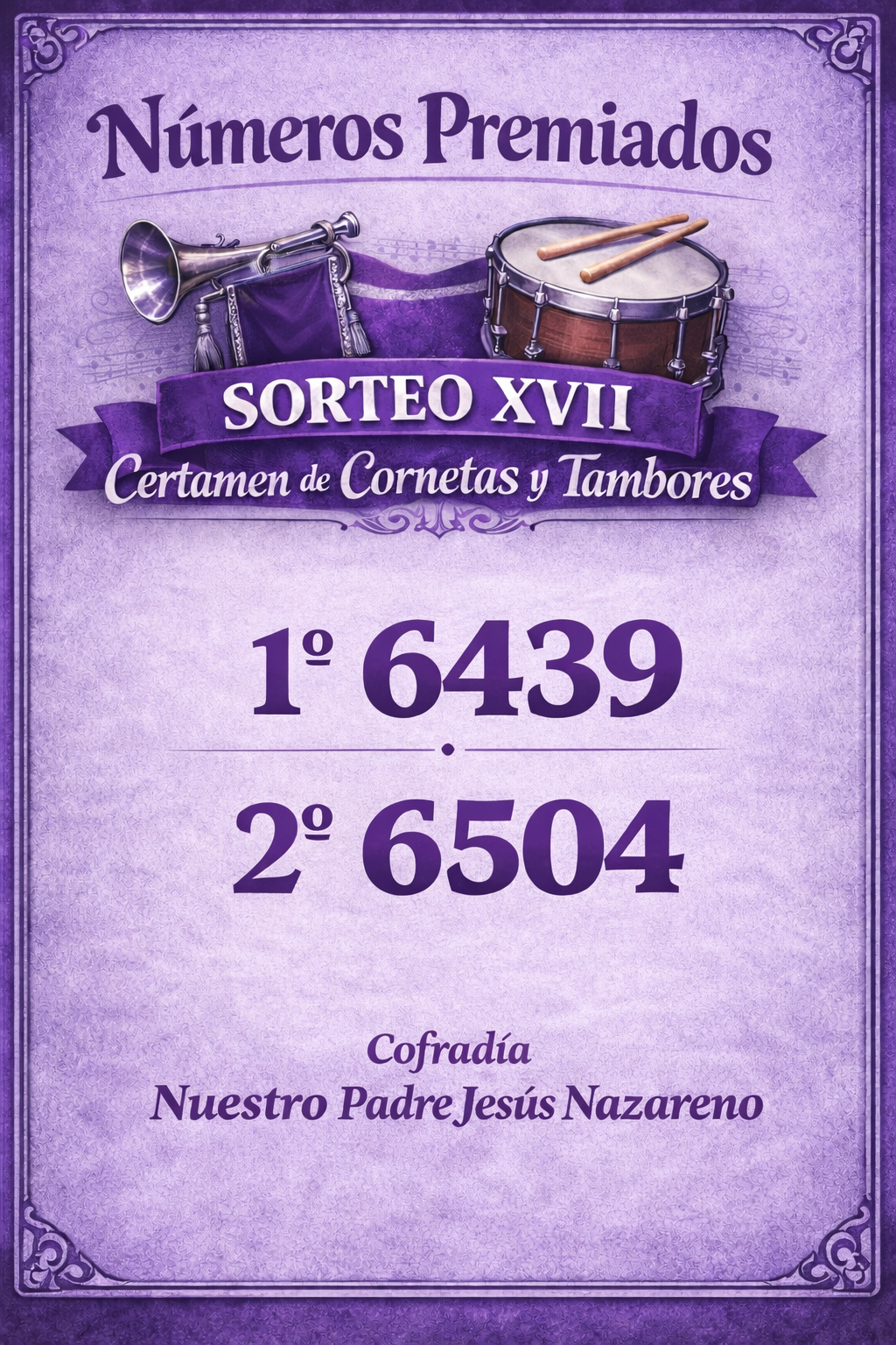 Números premiados sorteo XVII Certamen de cornetas y tambores 13/04/2026 Números premiados del sorteo del XVII Certamen de Cornetas y Tambores VER MÁS