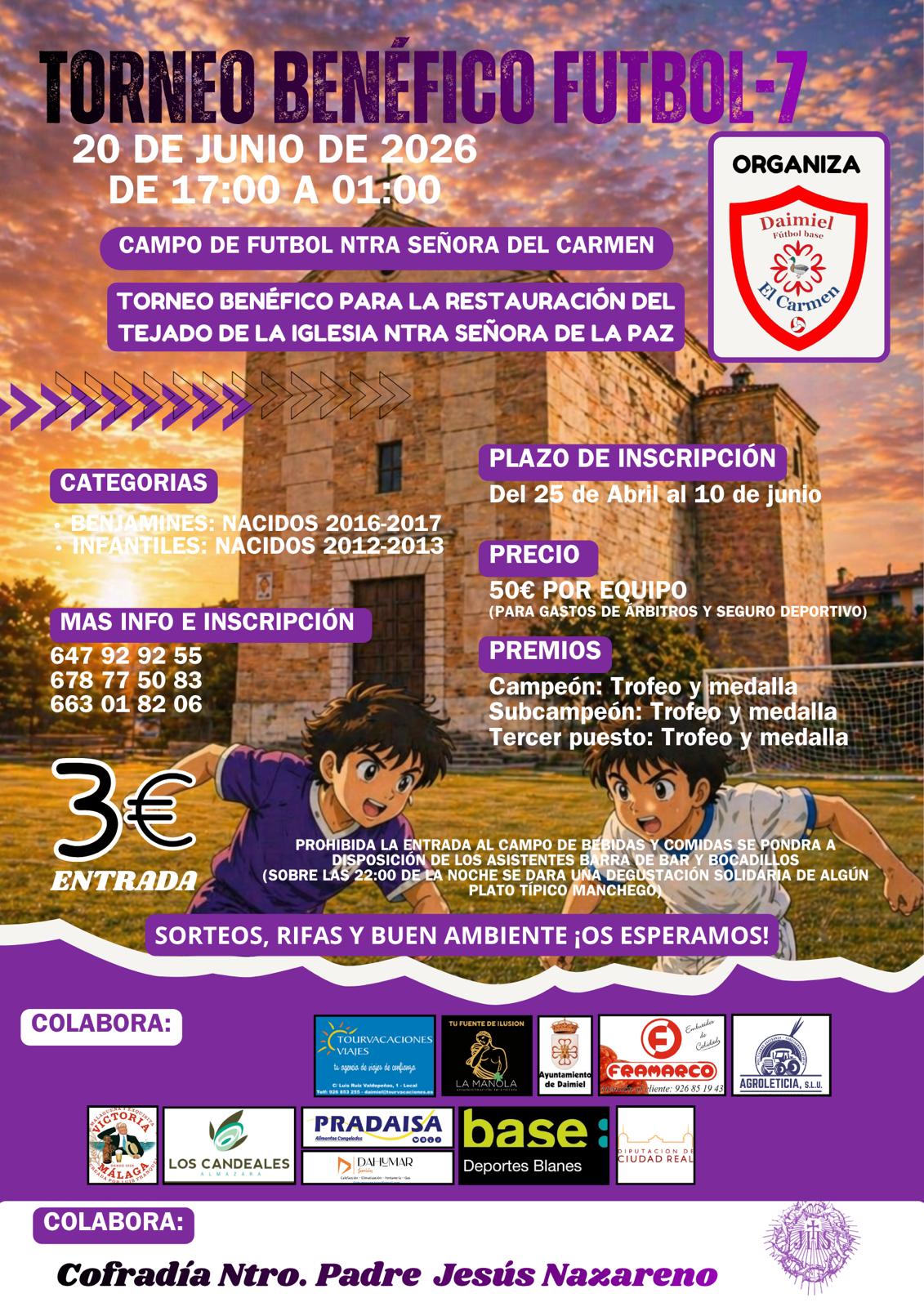 El próximo 20 de junio, de 17:00 a 01:00 h., se celebrará un torneo benéfico de fútbol 7 en el campo de fútbol Nuestra Señora del Carmen, organizado por Daimiel Fútbol Base El Carmen, con el objetivo de recaudar fondos para la restauración del tejado de la iglesia Nuestra Señora de la Paz.